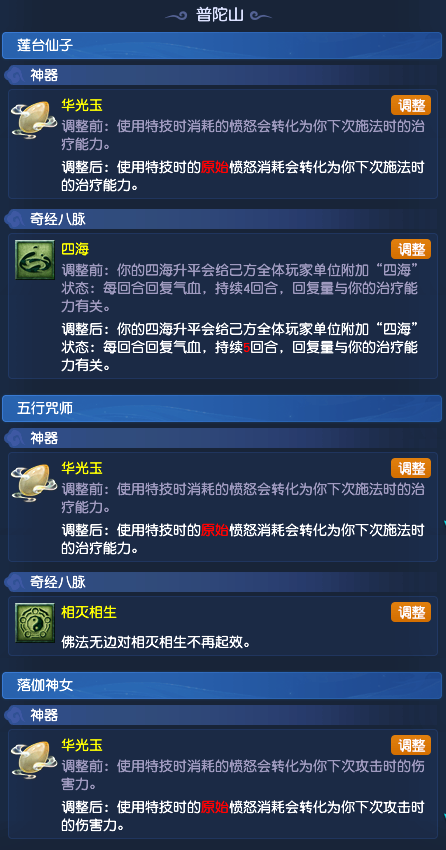 此次对普陀山的改动主要集中在神器方面。三个流派的神器技能由消耗愤怒变为原始愤怒,得到了一定程度的加强。“莲台仙子”流派的【四海】经脉由4回合变为5回合;“五行咒师”流派的相生相灭则不会受到佛法无边影响,相当于不能法连了。