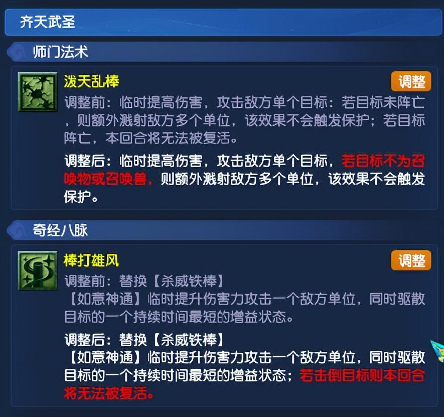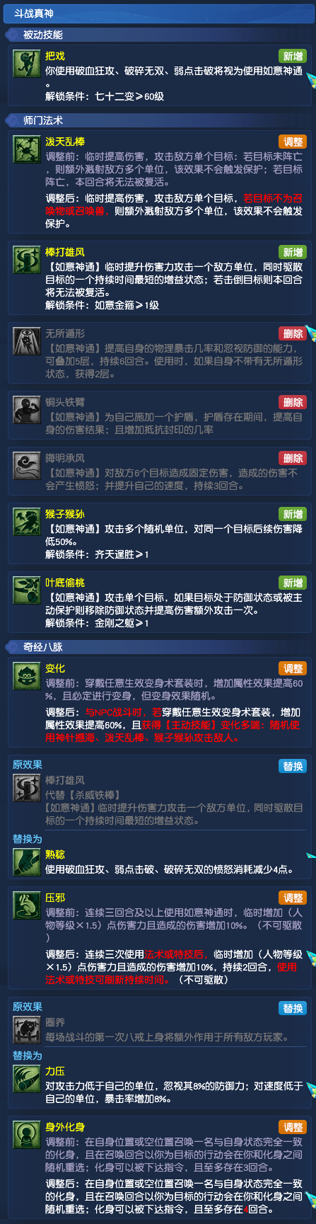 经脉效果方面,【变化】可在NPC战斗时获得主动技能【变化多端】,随机使用神针撼海、泼天乱棍、猴子猴孙攻击敌人,任务能力有了明显提升。【棒打雄风】被替换为【熟稔】,可降低破血、弱点、破碎的愤怒消耗。【压邪】经脉生效条件得到优化,用特技可刷新持续时间。【圈养】变为【力压】,攻击伤害低于自己的目标会忽视8%防御力,攻击速度低于自己的单位会增加8%暴击率。大招【身外化身】的化身由最多存在3回合变为4回合。