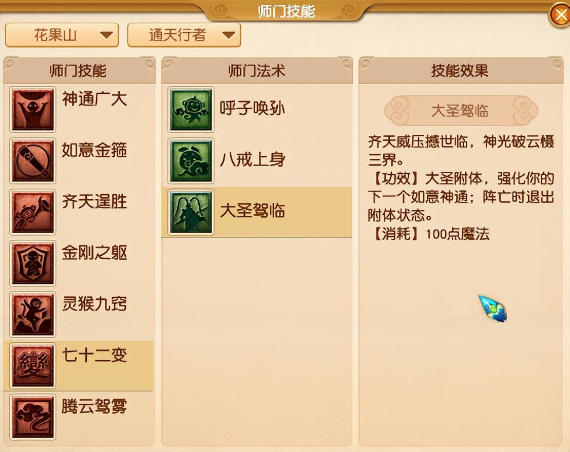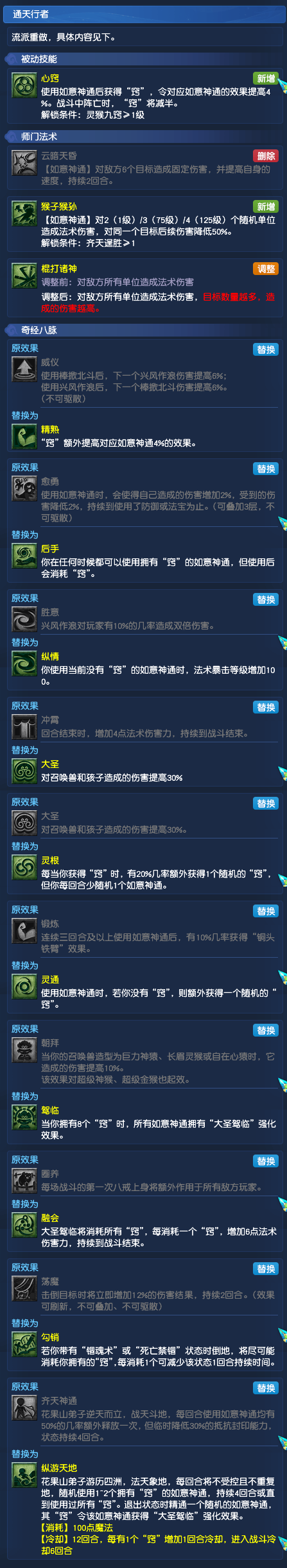 经脉方面进行了整体重做,其中【勾销】经脉可消耗所有“窍”减少“锢魂术”和“死亡禁锢”的持续回合,1点“窍”可减少1回合。门派大招变为【纵游天地】,每回合将不受控且不重复地随机使用1-2个拥有“窍”的如意神通,持续4回合或直到使用过所有“窍”。退出状态时精通一个随机的如意神通,其“窍”令该如意神通获得“大圣驾临”强化效果。