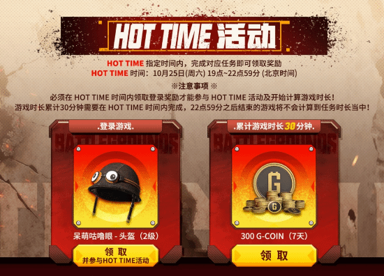 此次活动还将在10月25日(周六)19点至22点59分(北京时间)开启HOTTIME活动。在此时间段内登录游戏,玩家可以获得首次发布的皮肤“呆萌咕噜眼头盔”。累计游戏时长30分钟,还可获得300G-COIN(7天)的奖励,机会难得,千万不要错过!