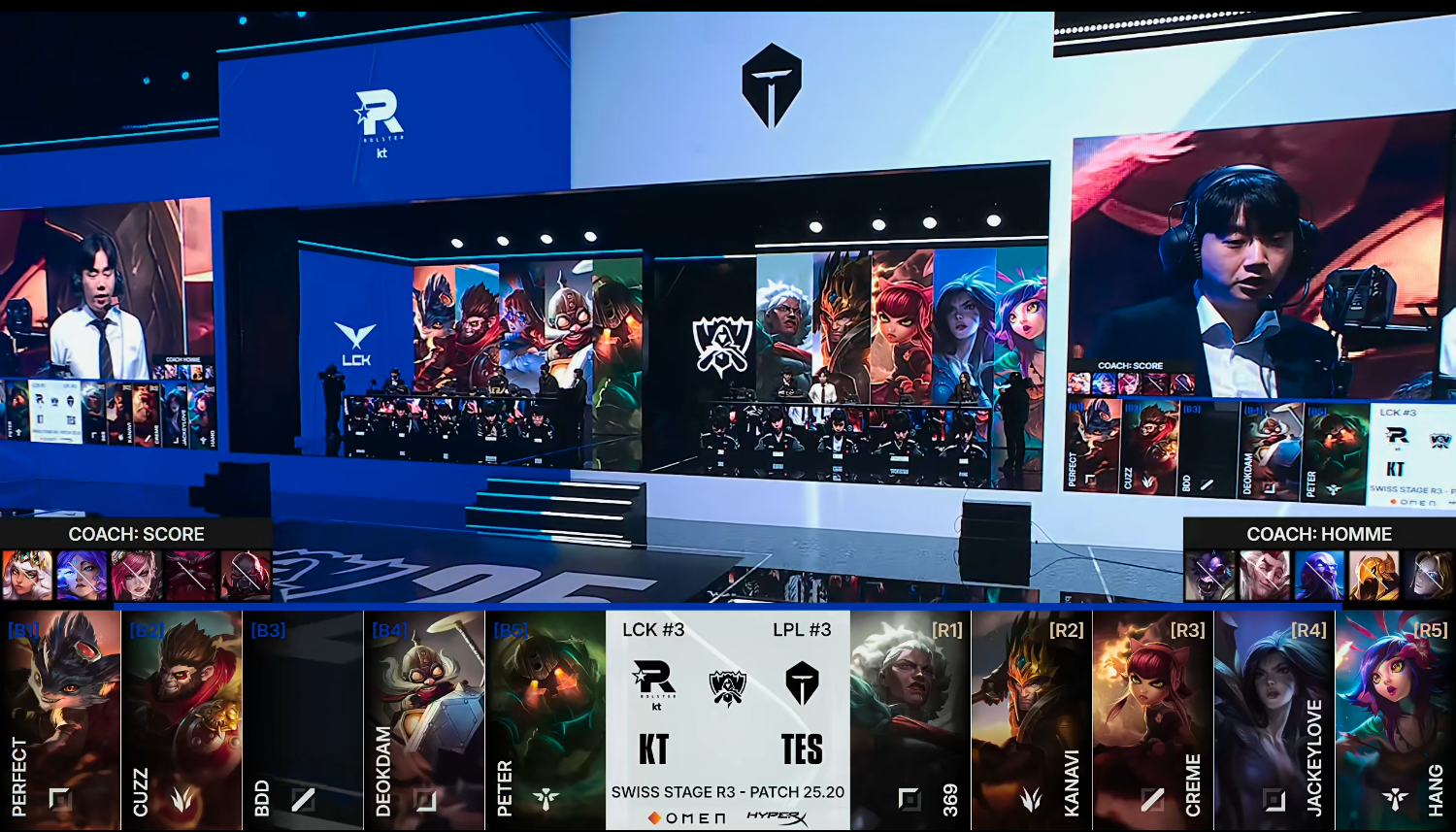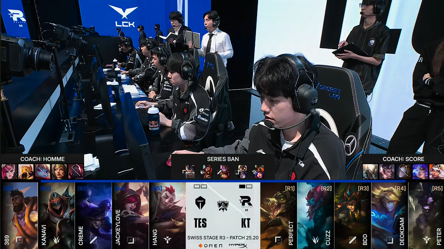 首局比赛,KT选择蓝色方,禁用奇亚娜、芸阿娜、蔚、奥恩、赛恩,选用PerfecT兰博、Cuzz猴子、Bdd阿萝拉、Deokdam飞机、Peter泰坦;而TES则位于红色方,禁用发条、沙皇、瑞兹、洛、牛头,选用369安蓓萨、Kanavi皇子、Creme安妮、JackeyLove卡莎、Hang妮蔻。