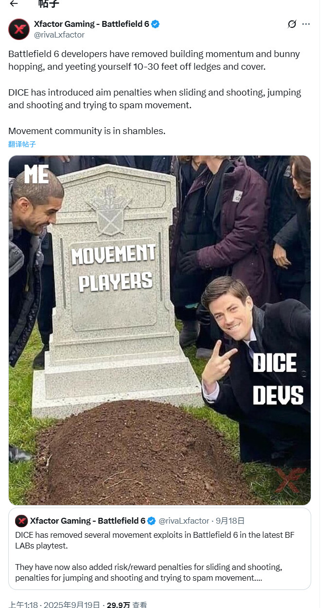 内容创作者用户@Reave当时在社交媒体上写道:“又一家3A工作室为了迎合那些每周只玩一小时、根本碰不到高端移动技巧玩家的人,而阉割了游戏的移动机制。”而另一位内容创作者@TeioStreams则回怼:“去放风筝吧兄弟。如果你想玩高机动射击游戏,就去玩COD。《战地》是另一种类型的游戏。”
