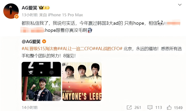 面对这些质疑,AL战队经理爱笑直接“闪现开团”,在社交媒体上与网友展开激烈对线。他直言不讳地表示:“都别私信我了,我说句实话,今年赢过韩国3大ad的,只有Hope,相信AL。”