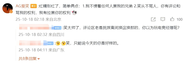 在评论区,爱笑更是火力全开,对那些认为Hope实力不行的粉丝直接开火:“天天这个强那个强的,我不知道那个强?”“杠精别杠了,简单俩点:1.我不惯着任何人黑我的兄弟 2.笑从不骂人,你有评论和骂我的权利,我有拉黑你的权利。”
