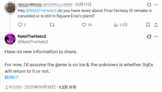 NateTheHate在回复一位询问项目进展的粉丝时表示:“我推测这个项目已经被搁置了,目前不确定Square Enix在未来是否会重新启动它。”这一言论无疑给期待《最终幻想9》重制版的玩家们泼了一盆冷水。
