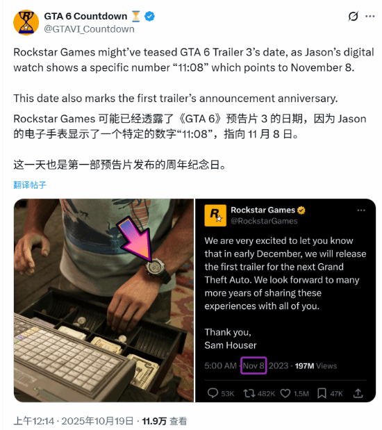 万众期待的《GTA6》将于2026年5月26日发售,玩家对第三部预告片的期待日益高涨。推主@GTAVI_Countdown今日发文称,游戏中杰森的数字手表显示时间为11:08,可能暗示预告片将于11月8日公布,这一天同时也是首部预告片的周年纪念日。