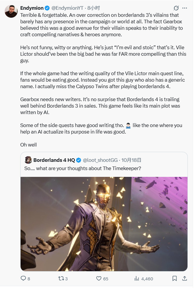 用户@EndymionYT更是借此机会对《无主之地4》的剧情进行了猛烈的批评,直言其剧情质量低下,简直就像是AI所写。他表示:“糟糕且令人遗忘。相比《无主之地3》的反派,这次完全是矫枉过正——在整个战役和世界中几乎没有任何存在感。Gearbox竟然认为这是塑造反派的正确方向,足以说明他们已经完全失去了创造引人入胜的剧情与英雄的能力。”