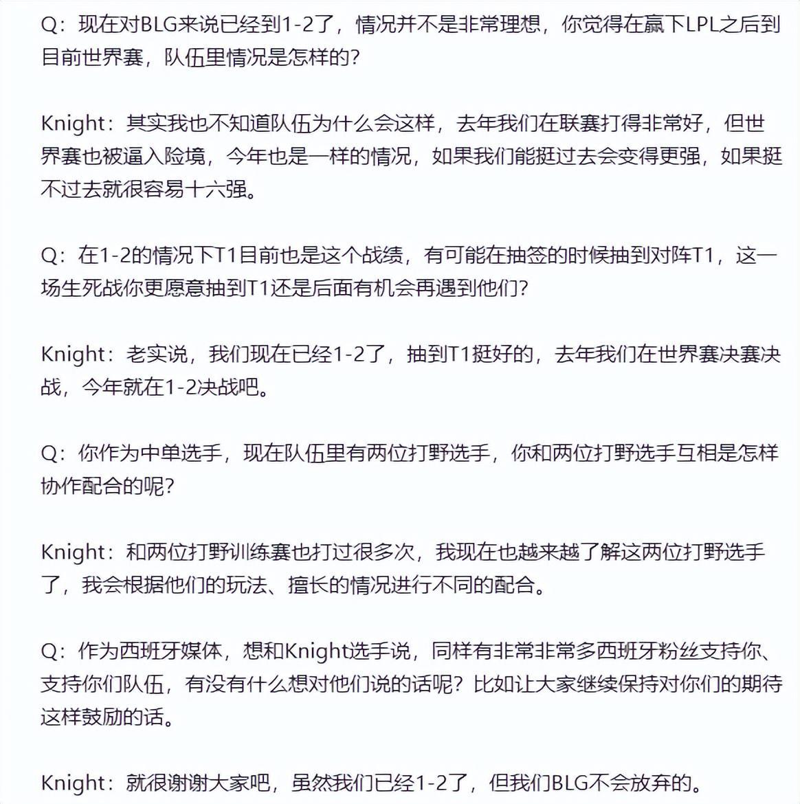 在输给G2后的采访中,当被问及1-2的战绩时,Knight坦言:“我们也不知道为何会陷入这样的境地,去年联赛我们表现出色,世界赛也被逼入绝境,但今年同样如此。我相信,只要我们能挺过这一关,就会变得更加强大。尽管目前战绩不佳,但BLG绝不会放弃。”