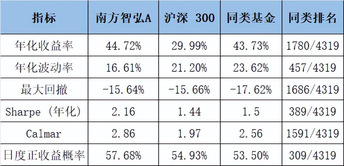 金岚枫在管的南方智弘混合(A:020645;C:020646)成立于2024年8月2日,截至9月30日产品成立以来累计涨幅达53.78%,同期沪深300涨幅仅35.72%。从风险收益比角度,南方智弘混合(A:020645)的Sharpe和Calmar等指标同样显著优于沪深300指数和多数偏股混合型基金。