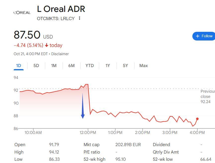 全球美妆行业领军者欧莱雅集团(L’Oréal)于2025年第三季度交出了一份喜忧参半的财务答卷。尽管集团总销售额实现0.5%的同比微增,扭转了二季度1.3%的下滑态势,但103.3亿欧元的业绩仍低于分析师预期的104.4亿欧元,同店销售增速4.2%亦未达4.85%的市场预期。这一表现直接引发资本市场剧烈反应,财报发布后美股粉单市场股价在5分钟内从涨2%转为跌超5%,最终收跌5.1%,创下年内单日最大跌幅。
