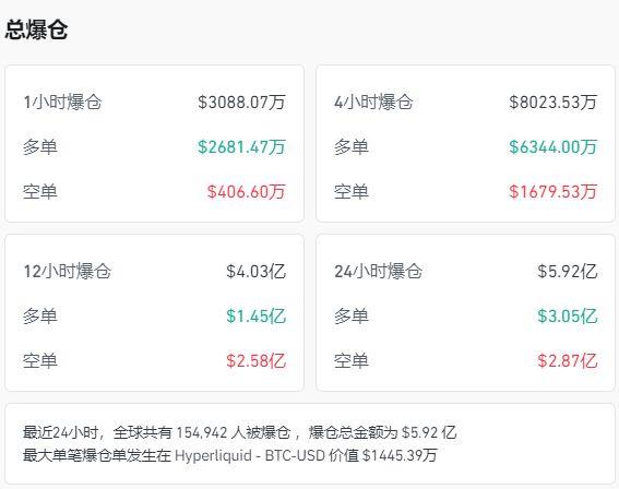 与此同时,加密货币市场也遭遇了重创。比特币来回震荡,coinglass数据显示,加密货币全网24小时超15万人爆仓,5.92亿美元(约合人民币42亿元)蒸发。这一数字令人震惊,也再次提醒了投资者加密货币市场的高风险性。