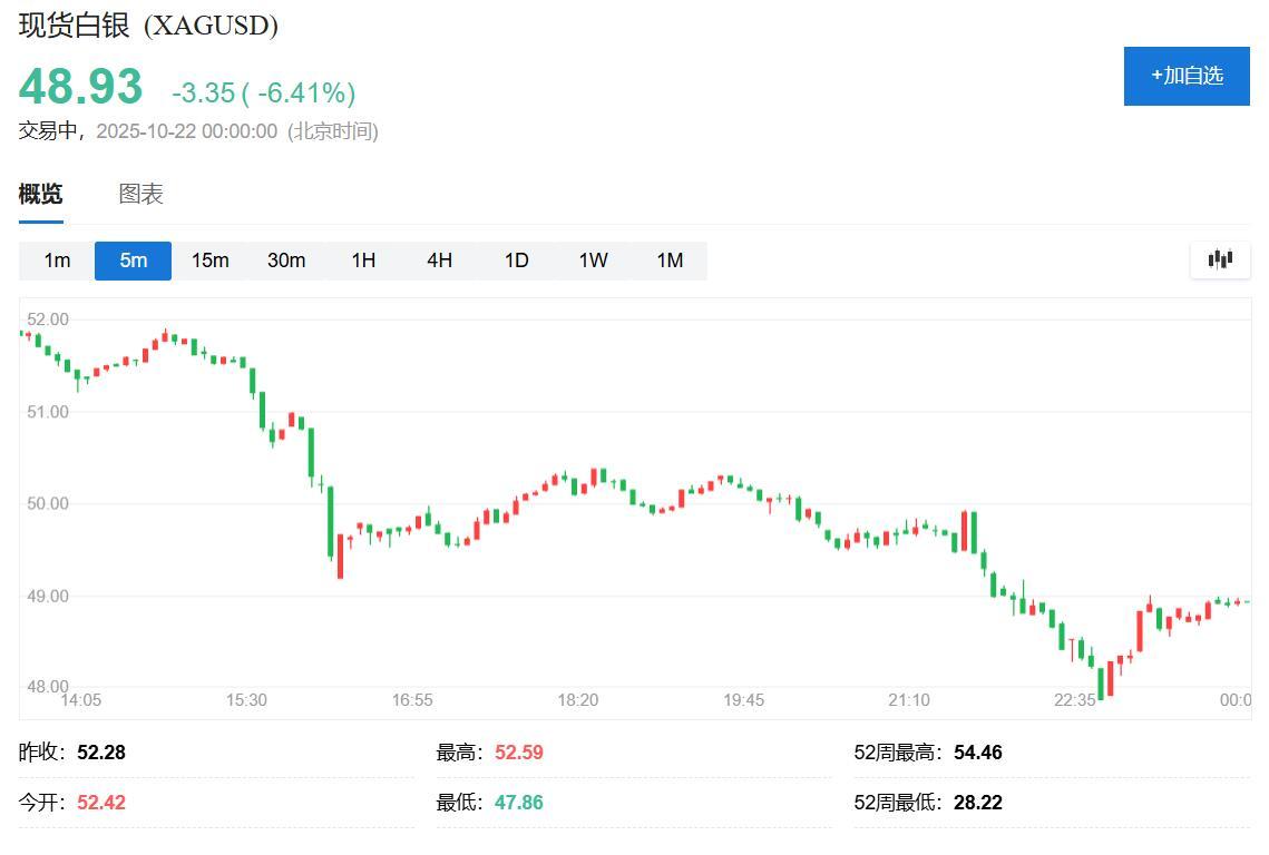 白银市场同样未能幸免。美股早盘时段,现货白银价格跌至47.90美元/盎司下方,日内跌幅近8.7%,创2021年2月以来最大盘中跌幅;纽约期银价格跌至47.12美元/盎司,日内跌幅约8.3%。白银的暴跌幅度甚至超过黄金,显示出市场情绪的剧烈波动。