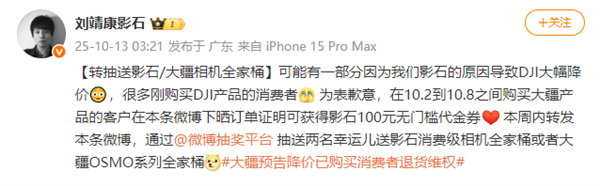 影石创新的90后创始人刘靖康在微博上演了一出“凡尔赛式道歉”。他半开玩笑地表示:“可能有一部分因为我们影石的原因导致大疆降价”,并“诚恳”地为购买了大疆产品的用户提供100元自家无门槛代金券,还抽奖送“全家桶”。这波操作堪称教科书级别的营销:以极低的成本蹭上行业老大的热点,暗示自身已强大到能逼迫巨头降价,同时塑造了“格局打开、体恤用户”的形象,成功将大疆用户的怨气转化为对自己的潜在好感。