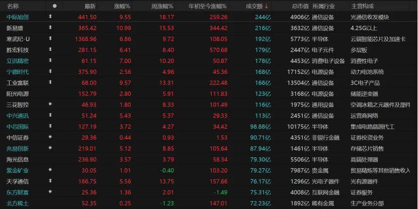 当日市场赚钱效应突出,共计4628只个股收涨,其中92只个股涨停;729只个股收跌,5只个股跌停。从成交活跃度来看,日成交额超过100亿元的个股达到10只。CPO概念板块中的“易中天”组合表现抢眼,中际旭创上涨9.55%报441.5元/股,新易盛涨停报365.42元/股,天孚通信上涨5.56%报166.75元/股。