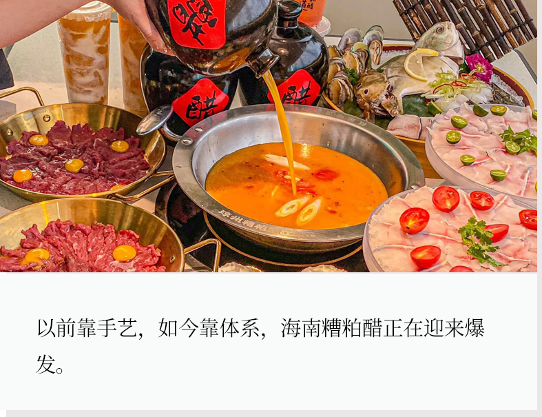 从地方小吃到全国爆款,糟粕醋的崛起路径清晰可见。海南本土品牌琼州糟粕醋·海南酸汤火锅自2020年创办以来,已在全国开出21家直营门店,三亚海棠湾、亚龙湾等门店常年排队。椰小鸡·椰子鸡则凭借“糟粕醋锅底”成为点单率最高的产品之一,目前在全国拥有31家门店。