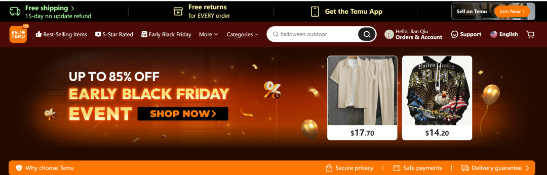 拼多多旗下Temu在美国市场推出八折至八五折优惠,直接叫板"黑五"和"网络星期一"。
