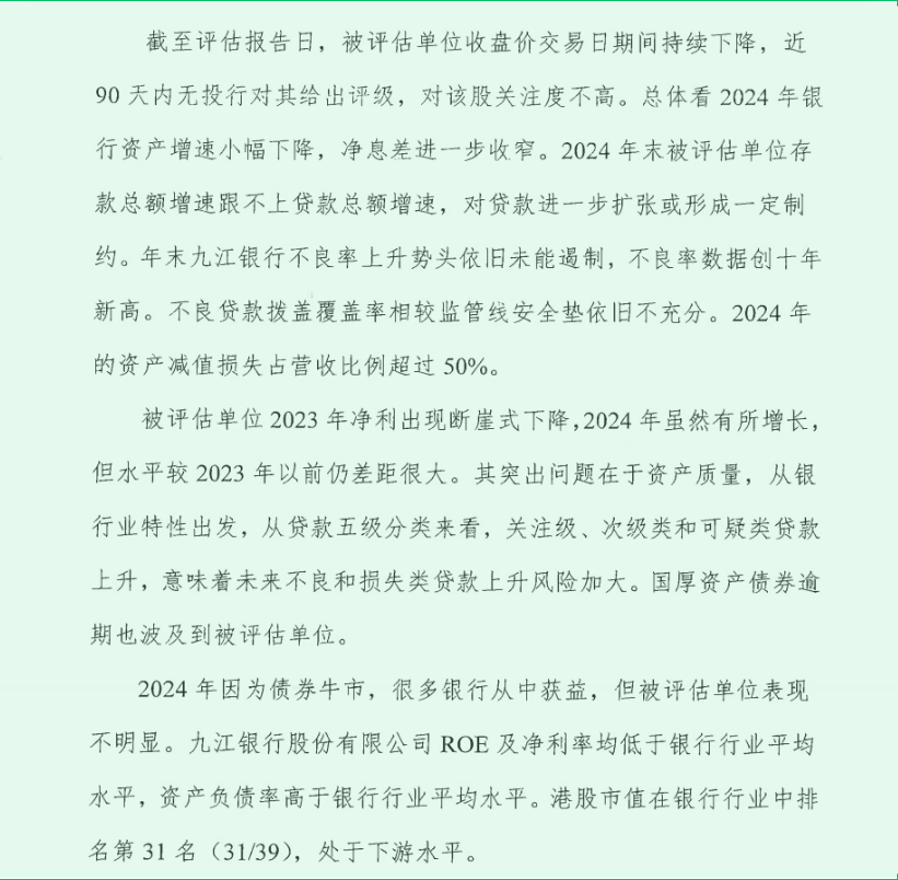 评估机构透露,本次评估中,通过申请执行人调取到江西宝申实业有限公司持有九江银行股份的股金证,部分股份变动由于当事人不完全配合,无法获取完整的变动情况,未能获取完整持有的股金证,收集到的股金证股数大于九江银行2024年报披露数据。