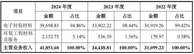 创达新材主营业务为高性能热固性复合材料的研发、生产和销售,目前主要产品包括环氧模塑料、液态环氧封装料、有机硅胶、酚醛模塑料和导电银胶等电子封装材料,广泛应用于半导体、汽车电子及其他电子电器等领域的封装,同时提供电子行业洁净室工程领域环氧工程材料及服务。