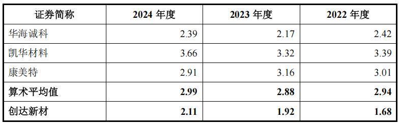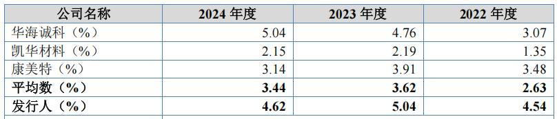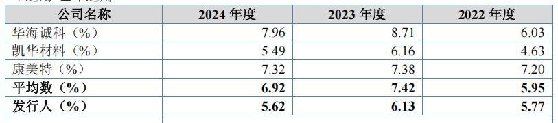 报告期内,创达新材综合毛利率水平和波动趋势与可比公司平均值不存在显著差异。2022年,公司综合毛利率水平低于可比公司;2023年、2024年,公司综合毛利率水平与凯华材料基本相当,高于华海诚科,低于康美特。