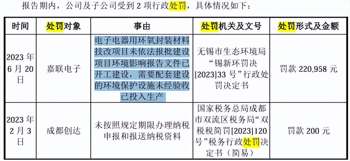 报告期内,公司及子公司受到2项行政处罚,主要为2023年6月20日嘉联电子电子电器用环氧封装材料技改项目未依法报批建设项目环境影响报告文件已开工建设,需要配套建设的环境保护设施未经验收已投入生产。