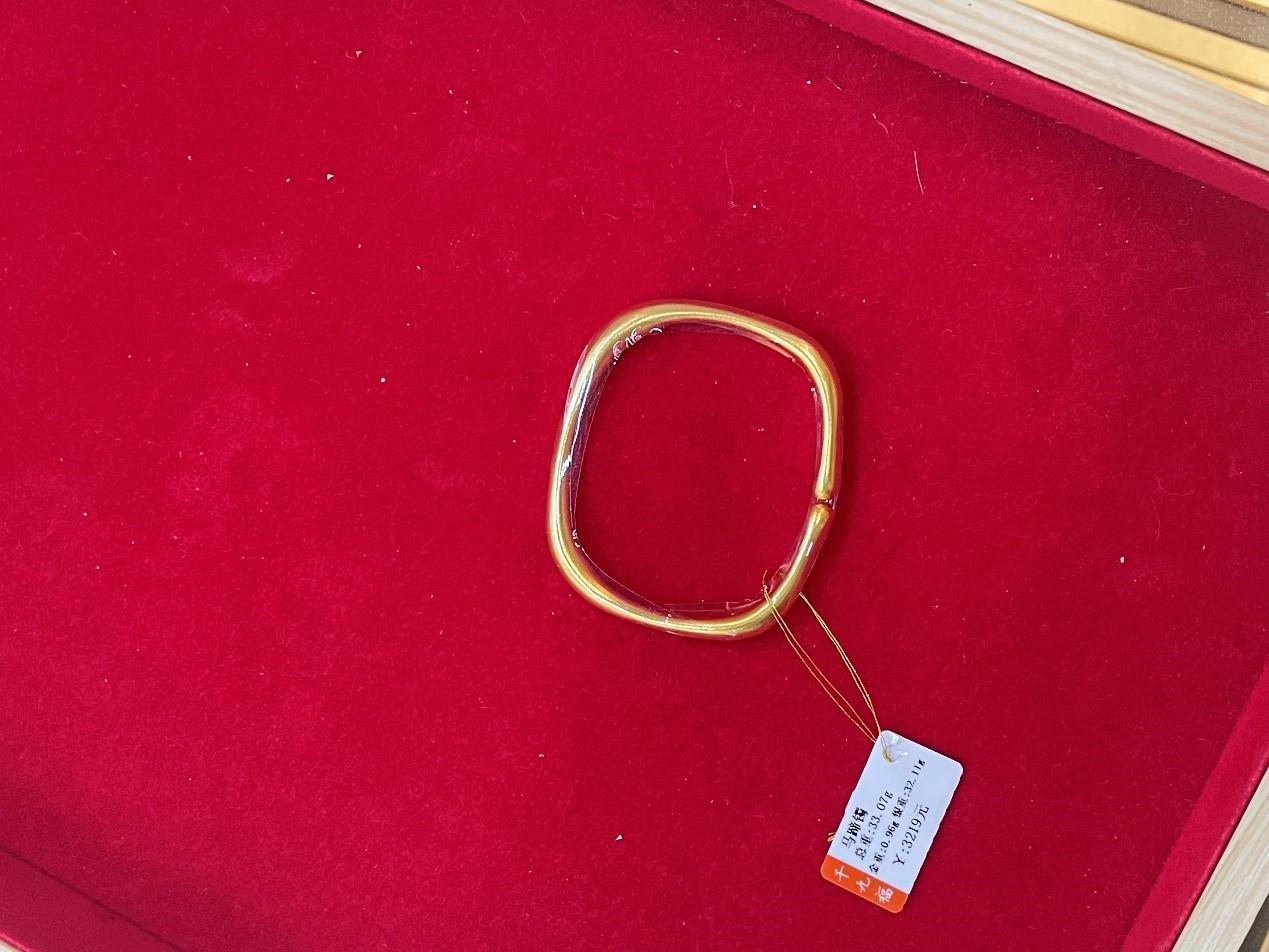 在该店铺内,琳琅满目的饰品均标注了克重和价格。据工作人员介绍,一款马蹄镯总重约33.07克,其中金重0.96克,银重32.11克,报价为3219元。