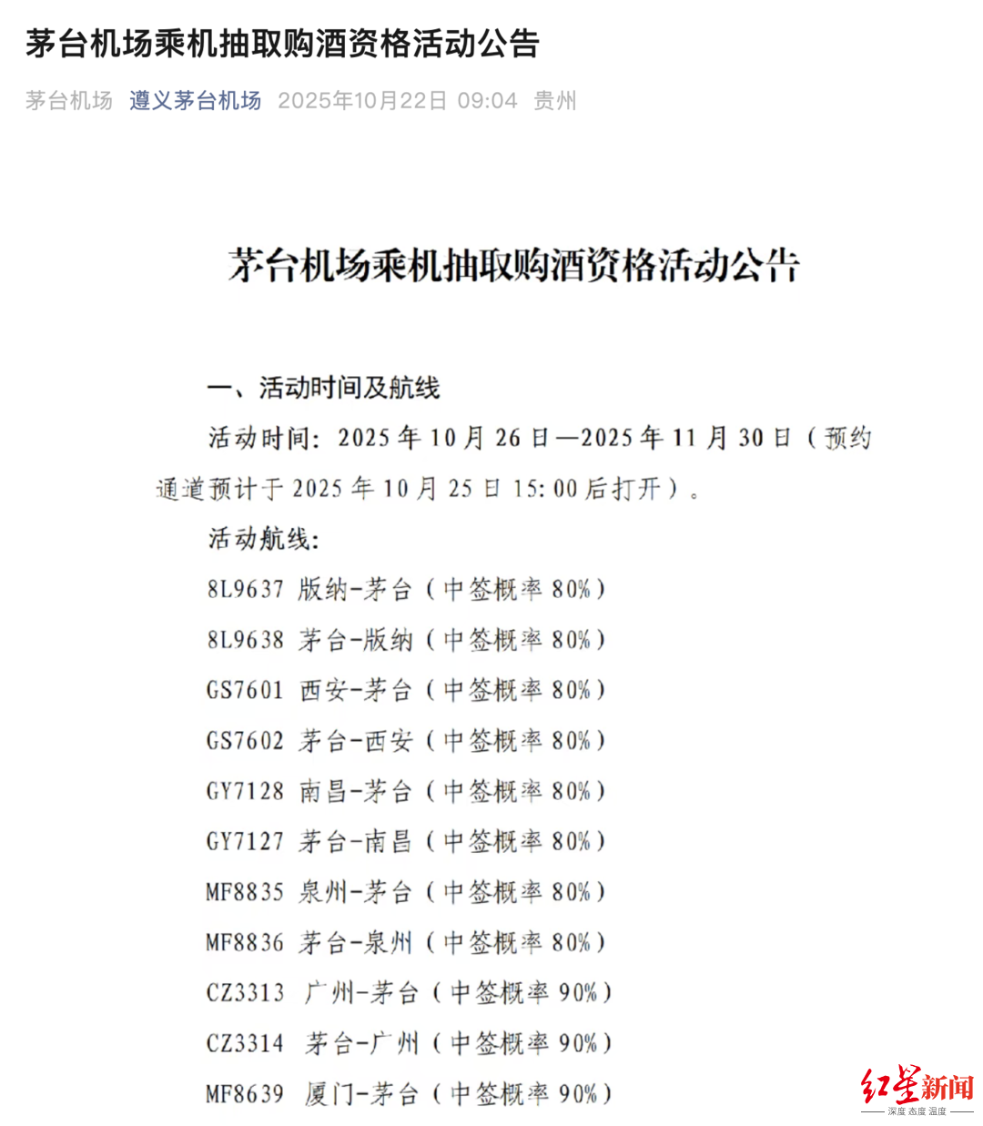 红星资本局10月22日消息,今日,遵义茅台机场再次宣布上调乘机抽取购酒资格活动的中签率,部分航班的中签率已飙升至90%,这一举措引起了市场的广泛关注。