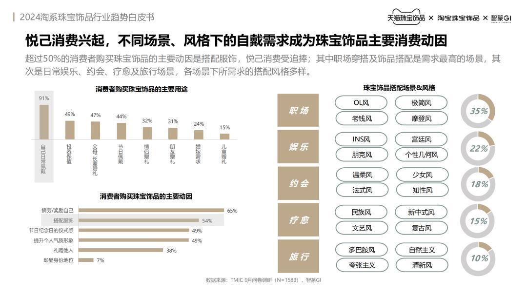 在周大福直播间买金的她,就是为了寻找秋冬的氛围感神器。《2024淘系珠宝饰品趋势白皮书》也显示,在人们购买珠宝饰品的主要动因中,有54%是为了搭配服饰。