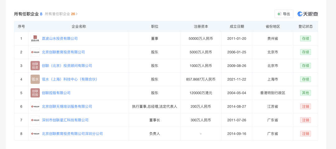 天眼查App显示,路行名下共关联8家企业,其中5家为存续状态,包括荔波山水投资有限公司、北京创联教育投资有限公司等,涉及教育投资、科技等多个领域。路行在上述公司中担任董事或持有股份,展现出其广泛的商业布局。
