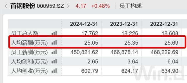 首钢股份的薪酬水平也相当不错。截至2024年末,公司职工总数为1.77万人,比2023年减少大约400余人。去年,公司人均创利2.65万元,人均税前薪酬达到25.05万元,虽然同比减少了3000元,但该薪酬水平无论在钢铁上市企业还是北京市属上市国企中,排名都相当靠前。