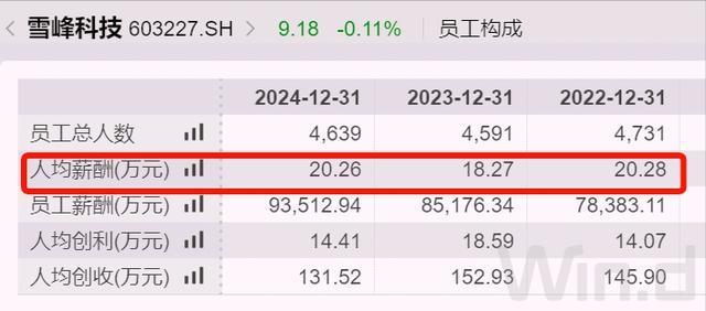 雪峰科技是国内民爆行业少数拥有武装守护押运资质的企业之一,业务与控股股东广东宏大高度协同。截至2024年末,公司职工总数4600余人,人均创利14.4万元,税前人均薪酬达20.3万元,较2023年增加2万元,且高于广东宏大的17.5万元。