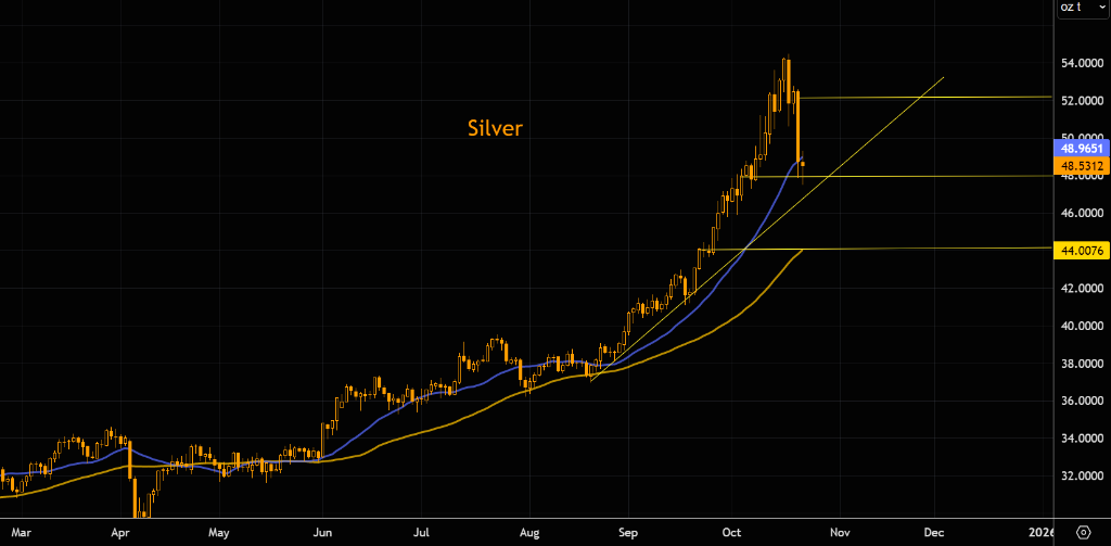 目前,银价正围绕其21日移动平均线波动,一条更短期的趋势线也位于48美元略下方,构成了密集的支撑区域。对于投资者而言,若银价无法守住48美元,则可能打开进一步下行的空间,下一个主要支撑位将是位于44美元的50日移动平均线。