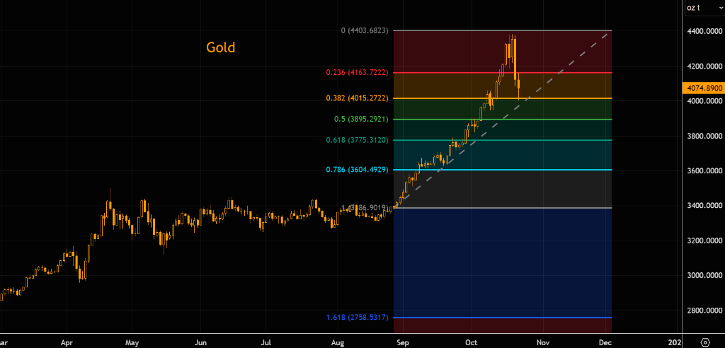 此后,金价虽小幅反弹,但目前恰好交投于自今年9月以来形成的一条上升趋势线上,这表明多空双方正在此进行激烈的博弈。从技术层面看,4000美元是黄金当前最重要的支撑,无论是从移动平均线还是斐波那契回撤角度看,该水平都极具“分量”。