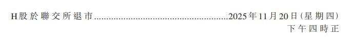 该行10月21日公告表示,H股将于2025年11月20日下午四时正于香港联交所退市,现时预期H股于联交所的最后交易日将为2025年11月13日。