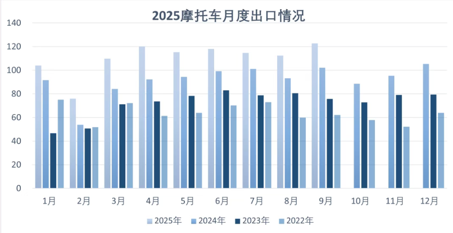 据中国摩托车商会最新数据显示,2025年1-9月我国摩托车出口量达996.74万辆,同比增长22.81%,出口金额65.96亿美元,平均单价661.75美元/辆。这一增长态势与国内市场形成鲜明对比,同期摩托车累计总销量1633.63万辆,同比增幅仅9.31%。