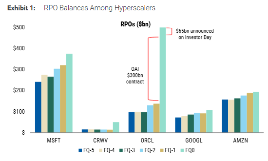 甲骨文的案例尤为典型:在最近投资者日上,该公司披露通过4个客户的7份合同获得650亿美元增量RPO,使其总额突破5000亿美元大关。这一数字与谷歌、亚马逊形成鲜明对比,后两者的RPO规模明显较小。