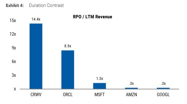 甲骨文和Coreweave的巨额RPO主要来自多年期合同,而微软、亚马逊、谷歌的协议期限相对较短。通过'RPO/过去12个月收入'比率可见: