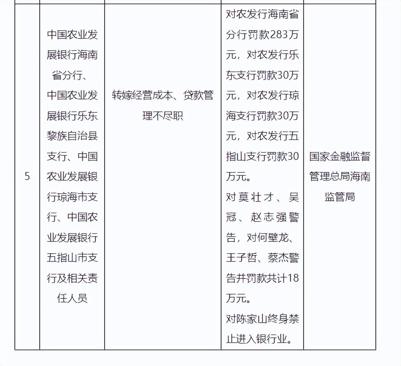 近日,国家金融监督管理总局海南监管局公布的一则行政处罚决定引发市场广泛关注。中国农业发展银行海南省分行及其辖内乐东、琼海、五指山三家支行,因存在转嫁经营成本、贷款管理不尽职等违规行为,被处以总计373万元的罚款。同时,相关责任人员也受到从警告到终身禁业的严厉惩处。