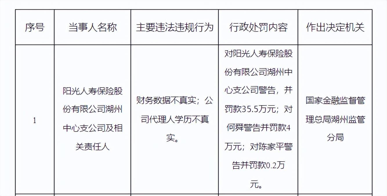 10月21日,阳光人寿湖州中心支公司因财务造假及代理人学历造假等严重问题,被国家金融监督管理总局湖州监管分局处以警告及35.5万元罚款;同时,相关责任人何舜被警告并罚款4万元,陈家平被警告并罚款0.2万元。这一处罚案例,直接指向了基层机构在财务与人员管理上的失控。