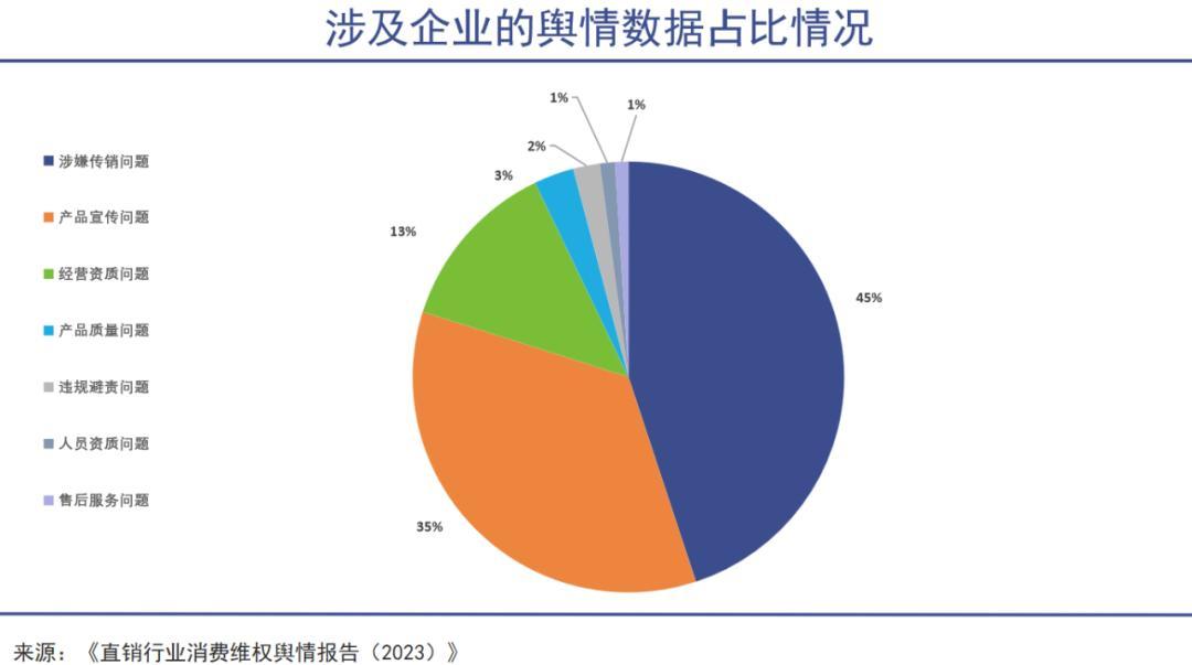 北京阳光消费大数据研究院、对外经济贸易大学消费者保护法研究中心、消费者网联合发布的《直销行业消费维权舆情报告(2023)》显示,涉及企业的舆情数据中涉嫌传销问题占比最大,为45%。