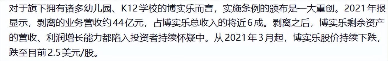 2021年《民办教育促进法实施条例》修订,明确禁止通过兼并收购、协议控制等方式控制义务教育民办学校,直接冲击博实乐核心商业模式。据《新学说》统计,其被迫剥离的幼儿园及双语学校业务在2021财年贡献58%营收。股价应声暴跌,从2021年初12.3美元跌至年底2.1美元,跌幅达82.9%。