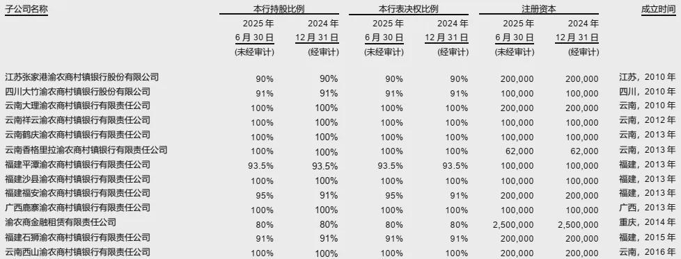 截至2025年6月底,重庆农商银行控股了12家村镇银行,遍布5省份12县(区、市),以云南和福建最多。这12家村镇银行累计总资产50.92亿元,较去年底有所下降;净资产19.65亿元,较去年底略有增加。然而,其不良贷款率较去年底明显增加,拨备覆盖率则大幅下滑,显示出一定的风险隐患。