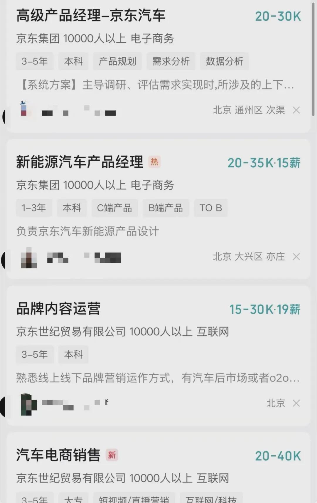 再看国内,各大招聘信息显示,京东正在大规模招募汽车相关岗位,包括算法、供应链、采销、售后等,年薪最高达百万。