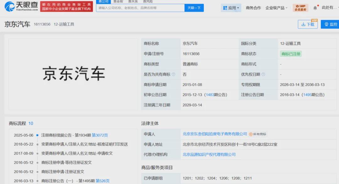 而京东的动作不止于此。天眼查信息显示,北京京东叁佰陆拾度电子商务有限公司已注册“京东汽车”“京东汽车 JD AUTO”“CAR.JD.COM”等商标,覆盖运输工具、广告销售、科学仪器等多个领域。