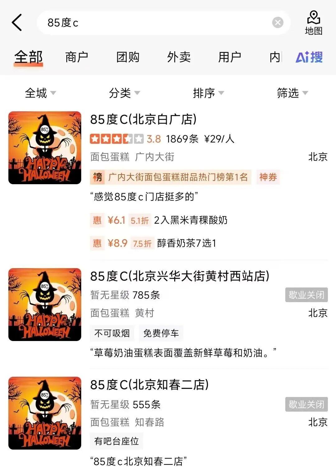 北京商报小编在大众点评上搜索发现,目前北京仅剩下85度C北京白广门店仍在营业。这一发现无疑加剧了消费者对品牌未来走向的猜测。
