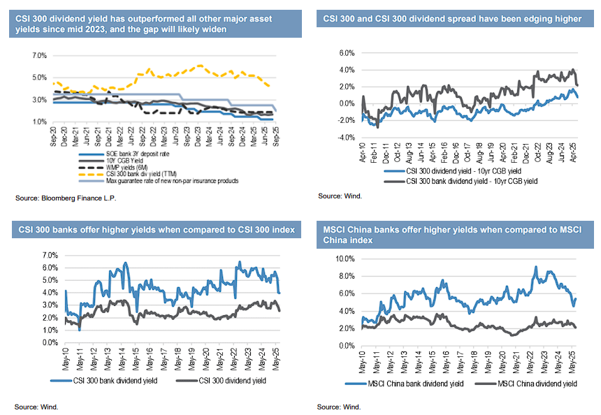 摩根大通数据显示,MSCI中国银行股和中证300银行股分别提供5.4%和4.3%的股息收益率,相对10年期国债的股息利差分别达到360个和250个基点。