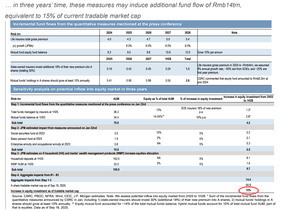 摩根大通预计,在政策引导下,未来三年将有约14万亿元人民币的增量资金流入股市,相当于A股流通市值的15%。