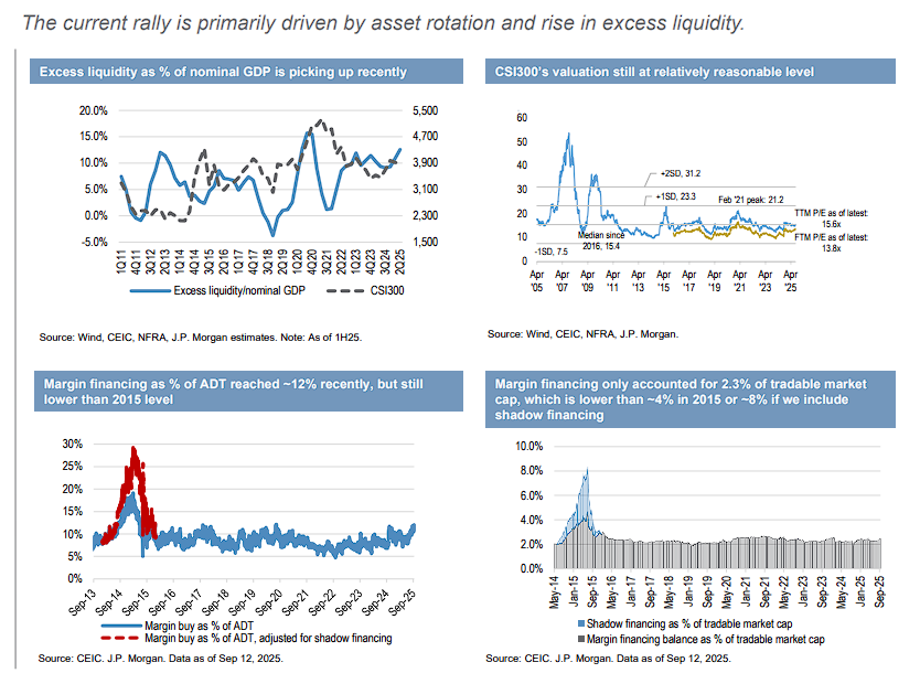 值得注意的是,对于本轮股市上涨,摩根大通分析显示,当前市场反弹主要由资产轮动和超额流动性上升驱动。融资融券余额占可交易市值的比例为2.3%,低于2015年的约4%水平,表明当前上涨具备可持续性。