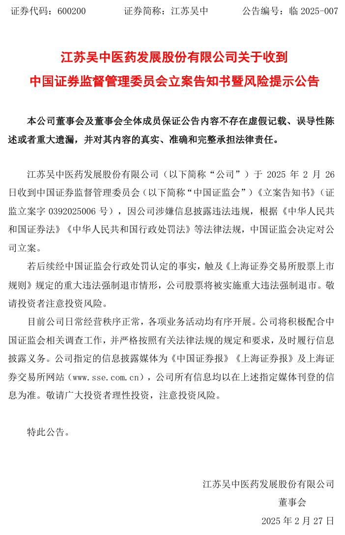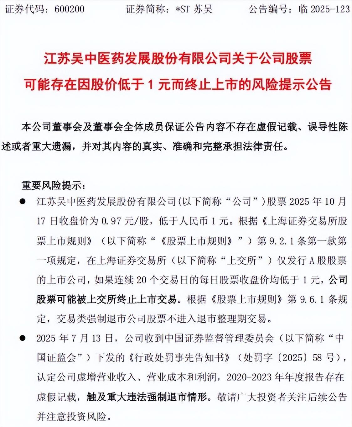 2025年2月26日,*ST苏吴因涉嫌信息披露违法违规被证监会立案调查。7月13日,公司收到《行政处罚事先告知书》,认定其通过虚增营业收入、营业成本和利润,导致2020年至2023年年度报告存在虚假记载,直接触发重大违法强制退市条款。此前10月18日,公司刚发布第6次面值退市风险提示公告。