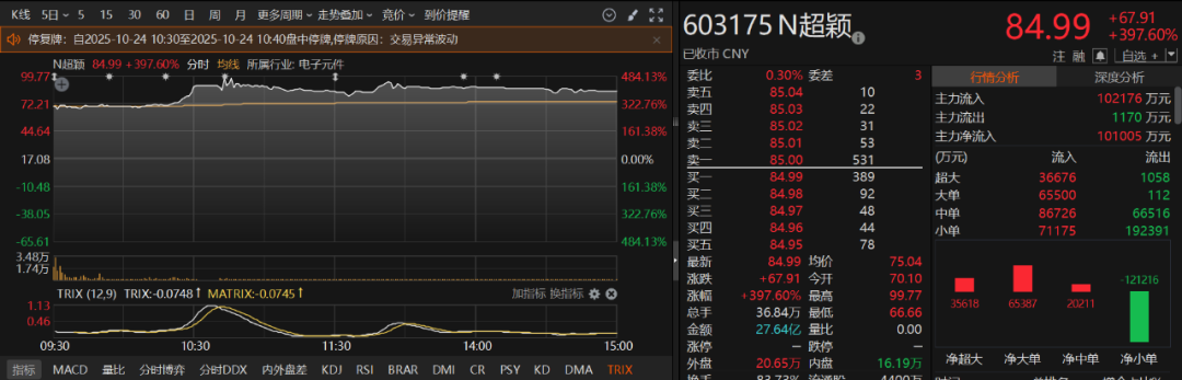 信号二:新股N超颖首日暴涨397.6%