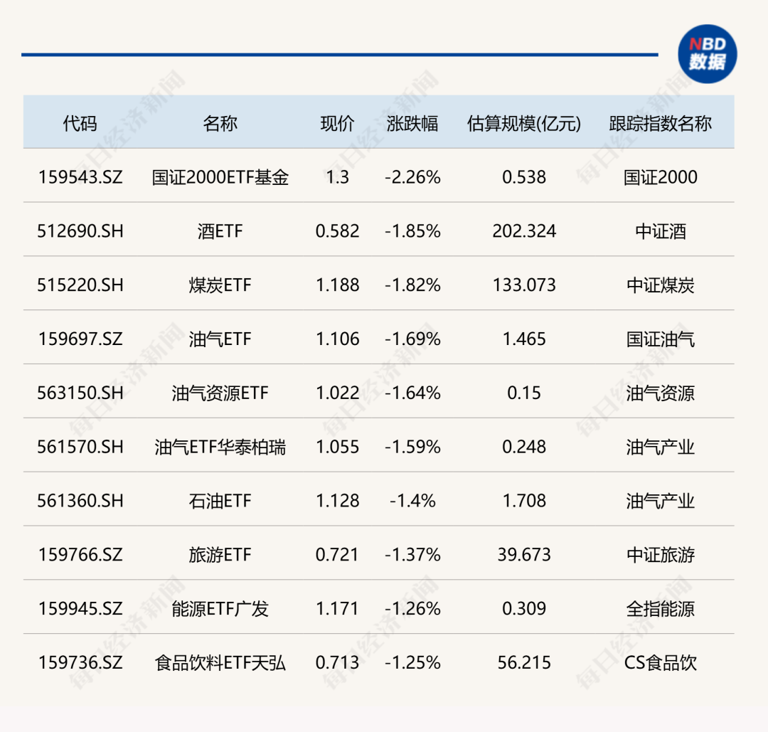 不过,市场并非全线上涨。下跌方面,国证2000ETF基金跌幅超过2%,显示出市场内部存在一定的分化。